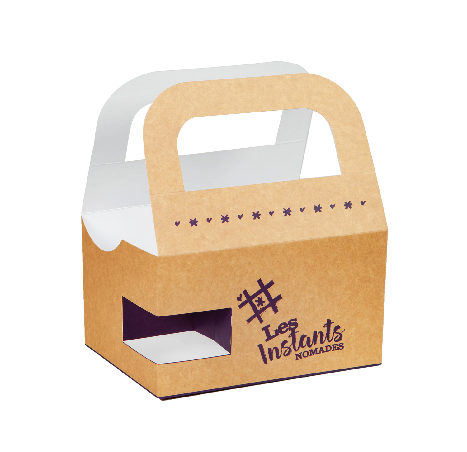 Une boîte de transport en carton brun à l'extérieur et blanc à l'intérieur. Vous disposez d'un compartiment modulable pour insérer une boisson et une encoche pour maintenir le sandwich.